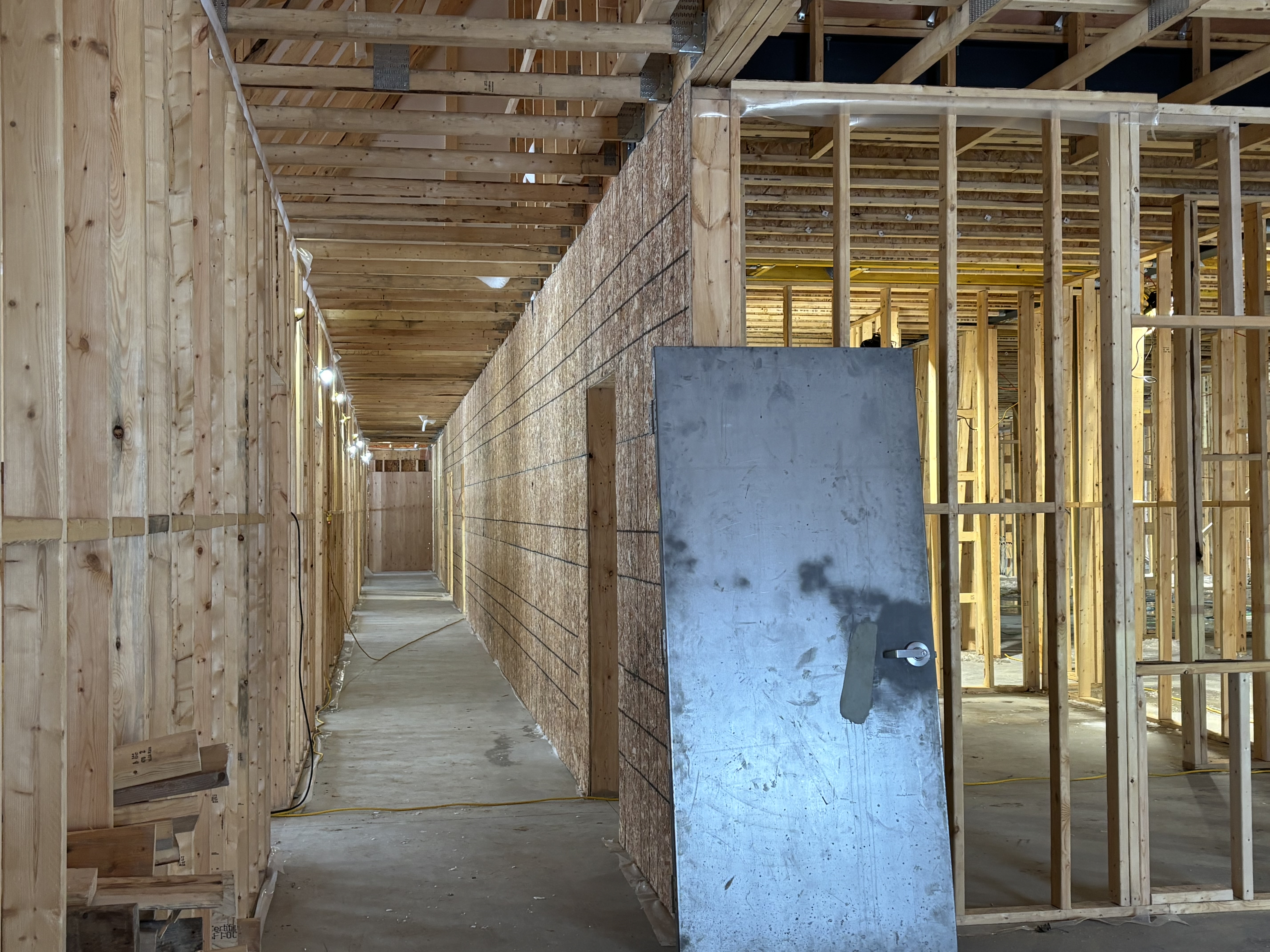Walking the floor of 426 Britannia for the first time, with an inside view of one of the living suites! Interior framing continues, while the roof is assembled outside for installation.