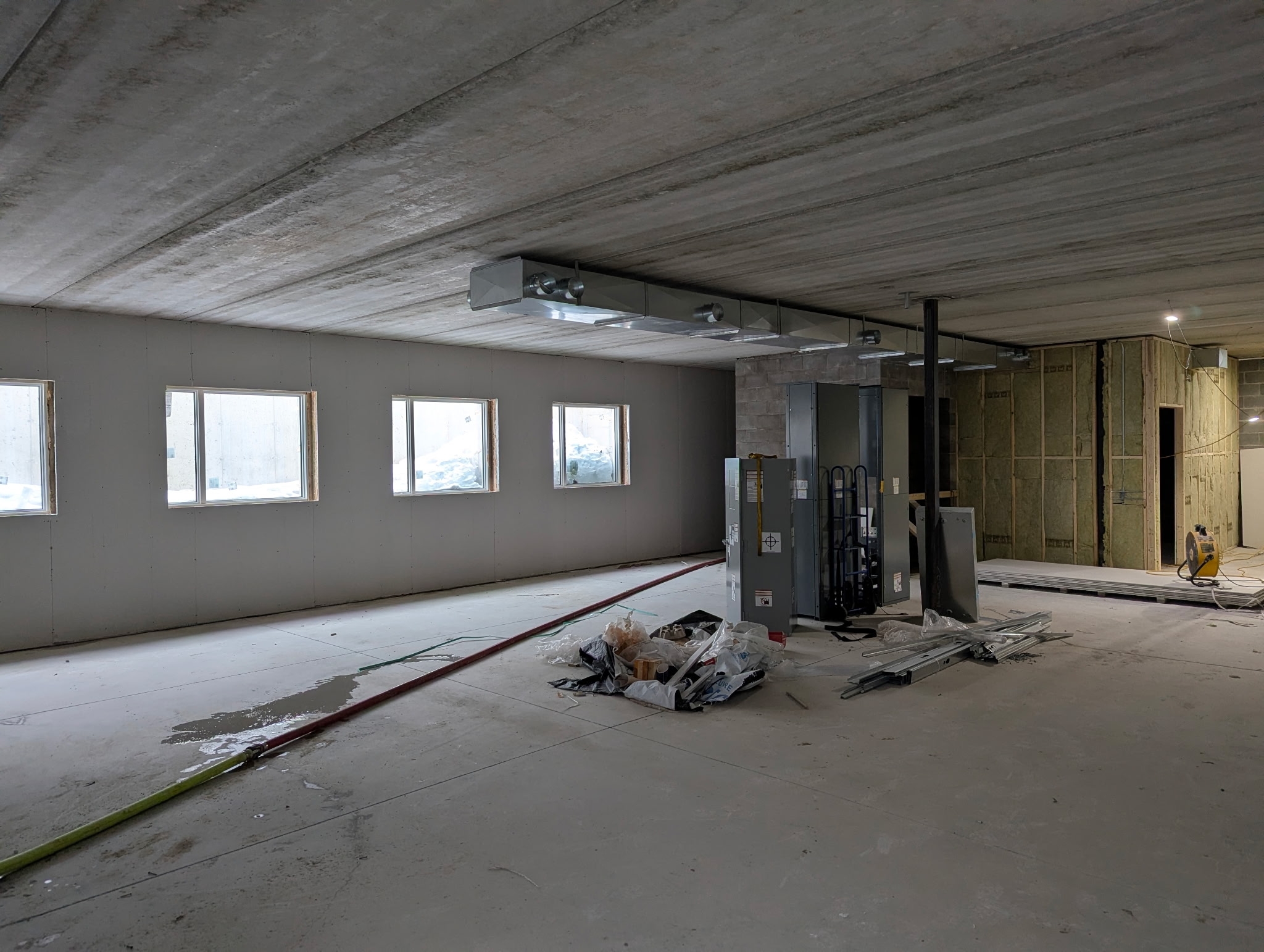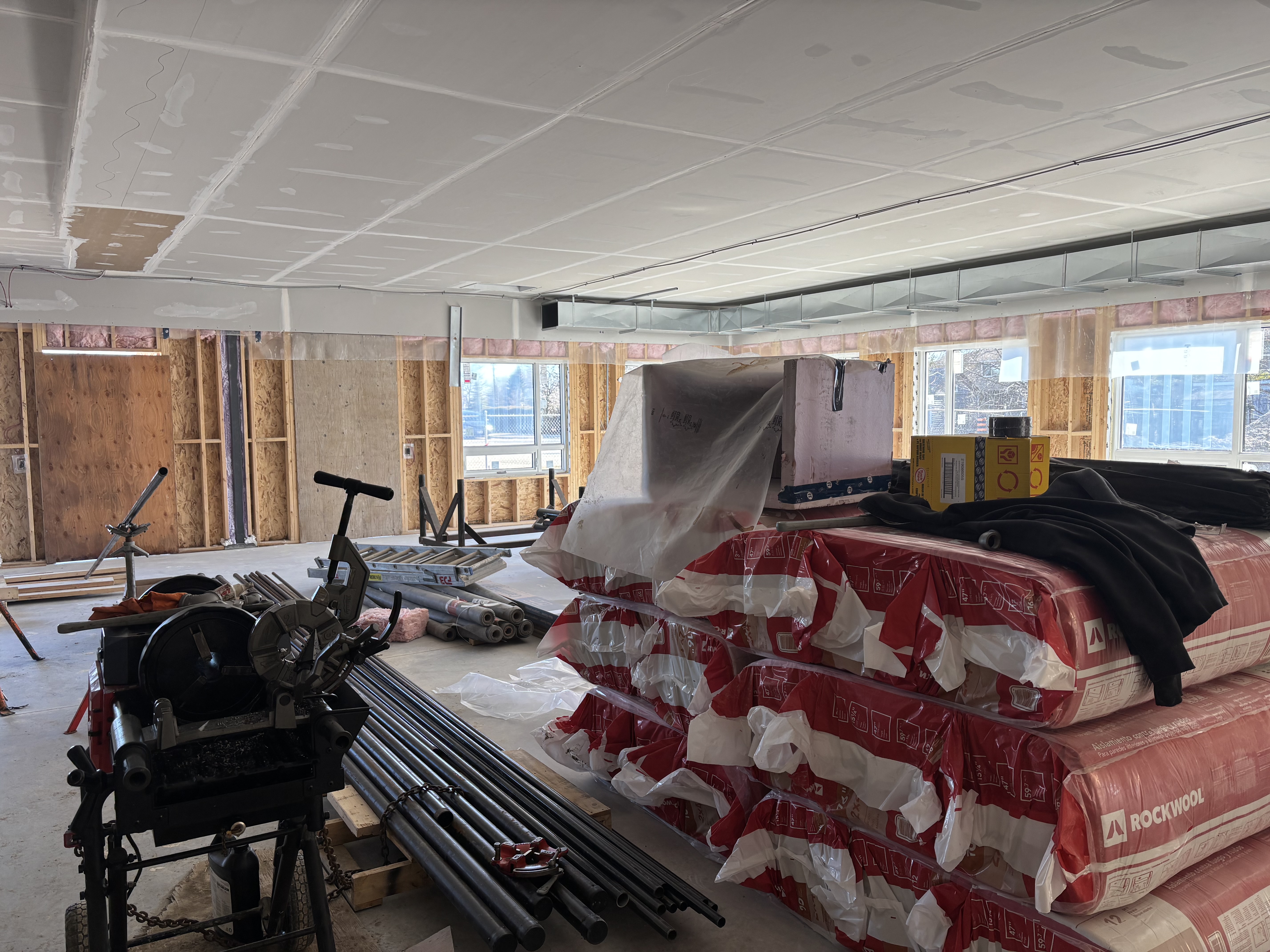 A look at one of the Activity Rooms, bright and spacious for Core Members to participate in programs and activities. Ductwork and insulating continues.